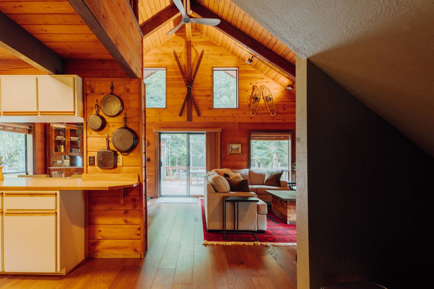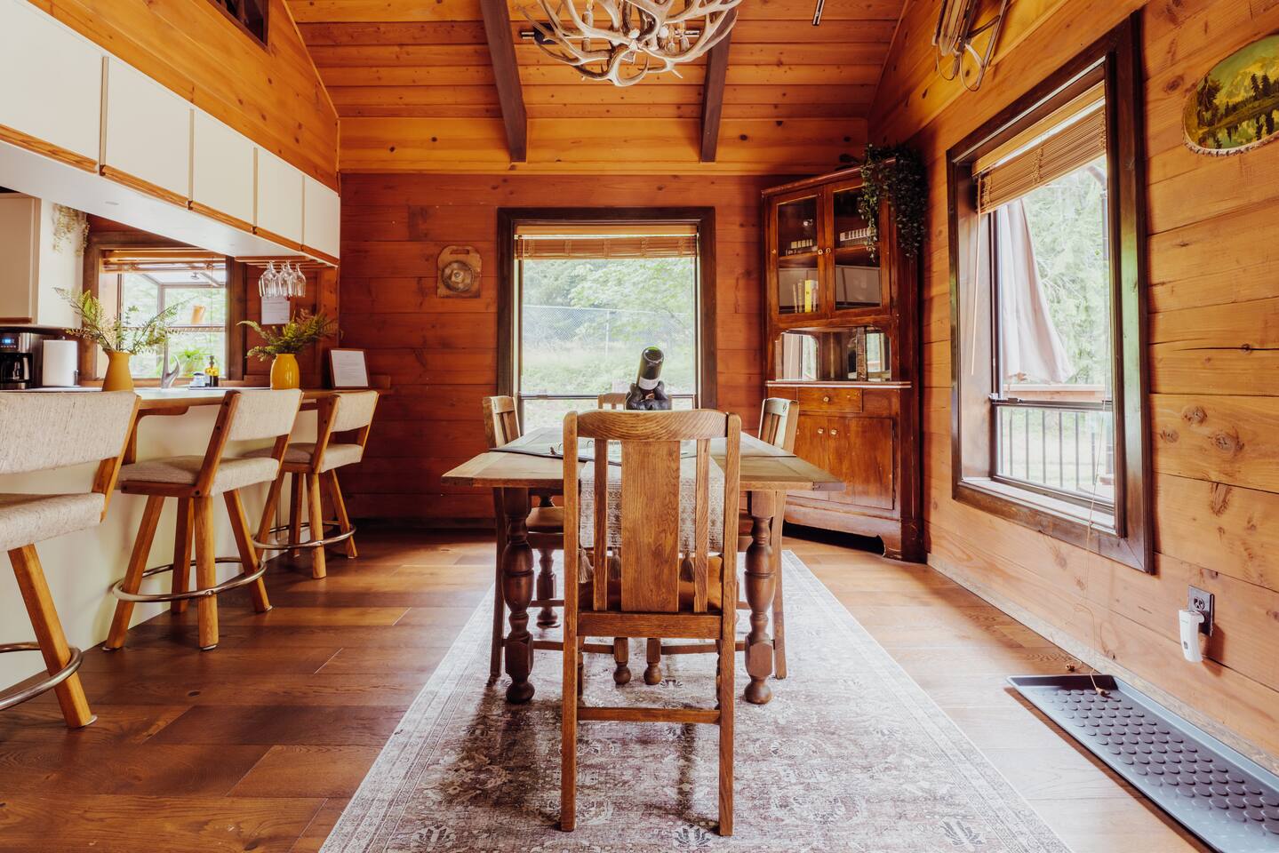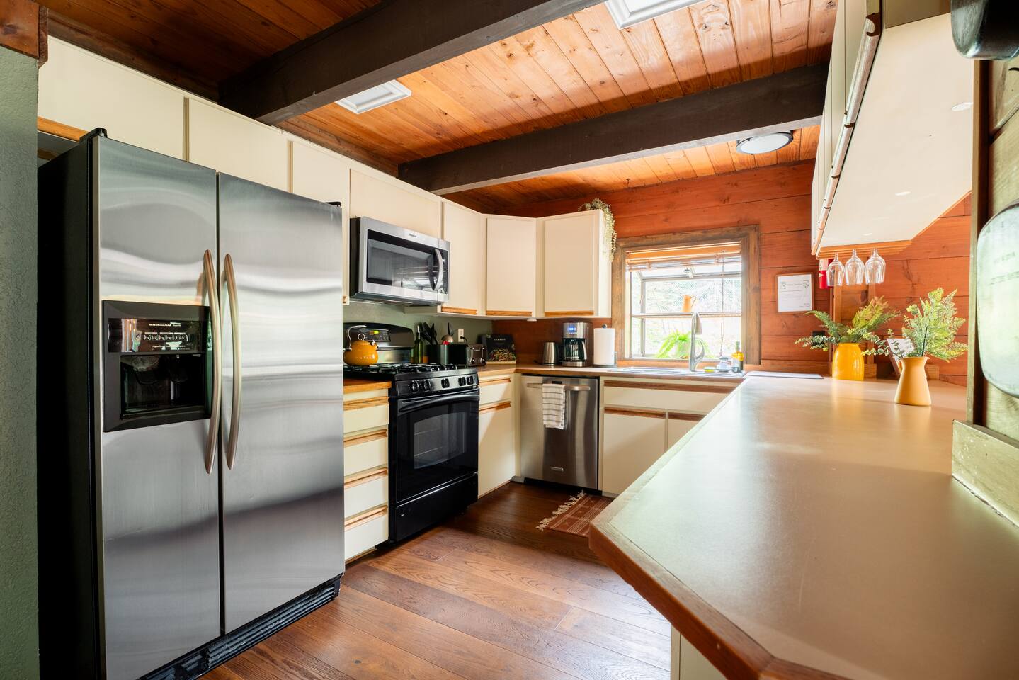 1 private bedroom featuring a queen bed and 1 private loft with 2 queen beds + a sleeper futon for the kiddos. Full sized kitchen has all of the basic cooking essentials needed for a family-sized dinner after a long day in the mountains. Open floor-plan provides the perfect space to enjoy each other's company. Cozy up by the wood-burning stove, cuddle up on the large sectional couch and watch Netflix while you unwind. Laundry units included if you have an extended stay or just need to do a quick load of laundry after a long day in the park. Relax, listen to the neighboring Copper Creek and sooth those sore muscles in the private and covered hot tub. Located in the backyard just off the deck and surrounded by nature. We are a 1.5 minute walk to the famous Copper Creek Restaurant. Let them cook and order takeout or dine-in for breakfast, lunch and/or dinner. Their huckleberry pie is incredible! Our home is NOT in a development. This is very rare for Ashford as most homes are very close to their neighbors and in cabin communities/developments. We are right off the main road into Mount Rainier National Park. We love the convenience, but note that you may hear some road noise. We are also 150 feet away, and across the creek from the Copper Creek Restaurant.